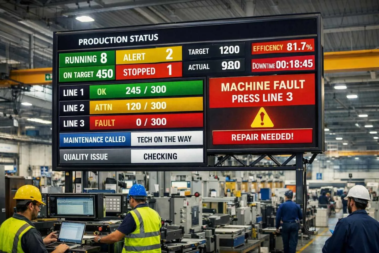 An Andon digital display board is a large LED screen installed in the production area to show live machine status, operator alerts, production counts, shift performance data, and downtime information in a format that everyone on the floor can read at a glance from any distance.